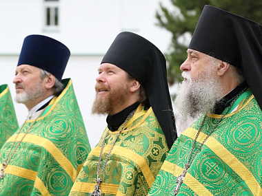 Святейший Патриарх Московский и всея Руси Кирилл возглавил служение праздничной Литургии на Соборной площади обители. Богослужение совершалось перед престолом, установленном на помосте с сенью у врат Успенского собора.