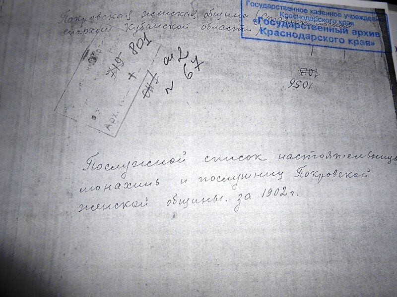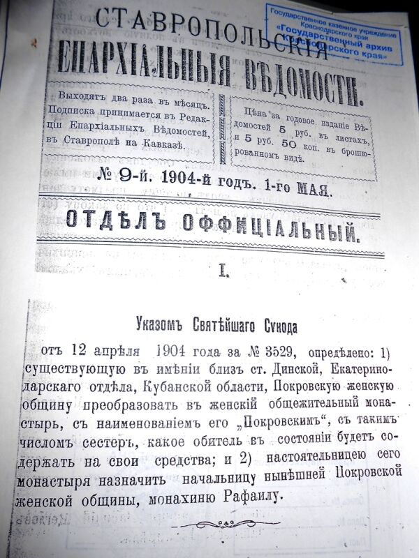 Пожелтевшая от времени брошюра с подробным описанием торжественного открытия Покровской общины в 1899 году преосвященным Агафодором сохранилась по промыслу Божию у одной прихожанки нашего монастыря в честь иконы Божией Матери «Всецарица». Сестра ее бабушки, Евсеева Фекла, была насельницей Покровского монастыря и умерла в возрасте 18 лет. Узнав, что мы создаем в Динском районе подворье, женщина подарила нам эту брошюру – их семейную реликвию. Называется она «Открытие Покровской общины близ станицы Динской, Кубанской области», состоит из 16 страниц и издана в 1899 году в типо-литографии Т.М. Тимофеева (Ставрополь-Кавказ). Перепечатана она из «Ставропольских Епархиальных Ведомостей». Адрес общины указан такой: чрез Пластуновскую станцию Ростово-Владикавказской железной дороги в Покровскую общину. Эта территория тогда относилась к Ставропольской епархии. При открытии общины в ней уже было 50 насельниц, управляла ею сестра Татиана Кончакова, впоследствии ставшая игуменией Рафаилой.