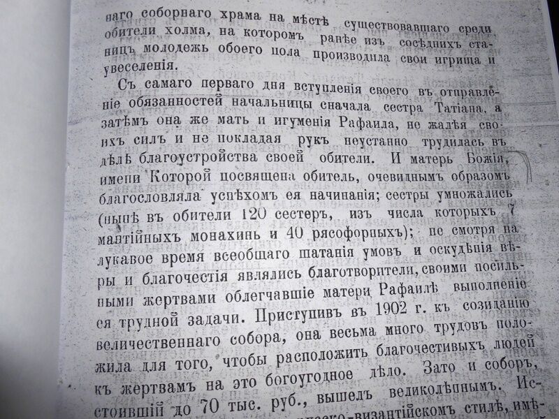 Но самой драгоценной находкой стала для нас статья Алексея Воскресенского, полученная из Справочно-информационного фонда Государственного архива Краснодарского края. Называется статья «Покровский женский монастырь в Кубанской области, Ставропольской епархии (из путевых заметок паломника)», опубликована она в «Ставропольских Епархиальных Ведомостях» №43 за 25 октября 1908 года. Написанные с любовью, эти путевые заметки живо представляют нам не только внешний вид и архитектуру монастыря, но и беззаветные труды по его созиданию матушки игумении с насельницами. Приведем выдержки из них. «Когда путник, идущий по однообразной Кубанской степи, или пассажир, едущий в вагоне ростово-владикавказской железной дороги, утомленный однообразием разстилающегося пред ним ландшафта, ищет на чем бы остановить свое исключительное внимание, их взору за целые десятки верст разстояния внезапно предстает массив весьма большого храма, с ярко горящими на главах его вызолоченными крестами. То – собор Покровского женского монастыря, приютившегося на одном из холмов волнообразной степи Кубанской, на берегу болотистой речки Кочети, в 40 верстах от областного г. Екатеринодара и в 4-х – от железнодорожного полустанка «Пластуновка», среди разбросанных окрест его, то там, то сям, хуторов казачьих. Направляющийся к монастырю путник непрестанно видит его пред собою. Как спасительный маяк среди безбрежной Кубанской степи, как светлая звезда, он служит для него показателем верного пути, маня и привлекая к себе, под священную сень свою. Великая хвала благопопечительнице обители, матери-игумении Рафаиле и ее сестрам, что путем чрезвычайных лишений, скорбей и слез, они смогли в такое короткое время воздвигнуть здесь такой прекрасный жертвенник Богу Живу, подобного которому далеко нет не только в окрестностях, но который бы сделал честь даже любому столичному городу. Как обстоятельства устройства настоящего великолепного храма, так и вообще вся история возникновения и постепенного развития обители до настоящего ее состояния включительно, безмолвно, но красноречиво говорят душе христианской о той непреложной истине, что близ Господь всем призывающим Его, – всем призывающим Его во истине… С самого первого дня вступления своего в отправление обязанностей начальницы сначала сестра Татьяна, а затем она же мать и игумения Рафаила, не жалея своих сил и не покладая рук неустанно трудилась в деле благоустройства своей обители. И Матерь Божия, имени Которой посвящена обитель, очевидным образом благословляла успехом ее начинания: сестры умножались (ныне в обители 120 сестер, из числа которых 7 мантийных монахинь и 40 рясофорных); несмотря на лукавое время всеобщего шатания умов и оскудения веры и благочестия являлись благотворители, своими посильными жертвами облегчавшие матери Рафаиле выполнение ее трудной задачи. Приступив в 1902 году к созиданию величественного собора, она весьма много трудов положила для того, чтобы расположить благочестивых людей к жертвам на это богоугодное дело. Зато и собор, стоивший до 70 тыс. руб., вышел великолепным. Исполненный в древнем русско-византийском стиле, имеющий крестообразную форму, увенчанный 25 главами (5 больших и 20 малых), с ярко блестящими на нем вызолоченными крестами, он представляет собою грандиозное сооружение. Три ш