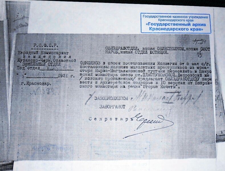 Поскольку малолетние преступники не могли ухаживать за посевами на такой большой площади и убирать урожай, на базе монастыря была образована сельхозартель «Правда». Это мы узнали из хранящегося в краевом госархиве постановления коллегии Кубано-Черноморского областного Земельного отдела: в июле 1921 года коллегия Облземотдела постановила «уборку урожая 1921 года произвести в так называемой Покровской трудовой с/х земледельческой производственной артели «Правда», устранить от всякого вмешательства в дела земледельческого хозяйства колонию малолетних преступников, забрать по акту у колонии всё имеющее отношение к сельскому хозяйству артели, как то с/х орудия, живой инвентарь, складочные помещения и т.п. и т.д.» Несколько лет существовала сельхозартель, в ней трудились насельницы монастыря. Затем сведения об артели в архивах прерываются.