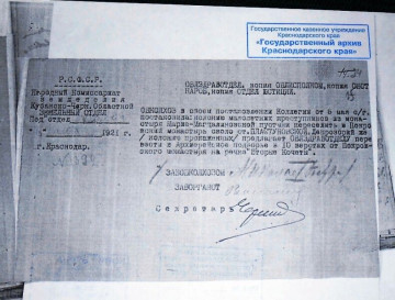 Но настоящую беду принесло монастырю восстановление на Кубани советской власти. Об этом тоже говорят архивные документы. 5-м мая 1921-го года датировано письмо, адресованное Отделу юстиции, за подписью Председателя Кубано-Черноморского облисполкома. Вот содержание этого письма, хранящегося в архиве: «Кубчероблисполком предлагает вне всякой очереди сделать распоряжение о немедленном и безоговорочном выселении монахинь из Покровского монастыря близ станицы Пластуновской, взять на учет все монастырские угодья с живым и мертвым инвентарем и передать таковые в распоряжение Кубано-Черноморского Областного Приюта». 24 июля 1921 года в присутствии понятых – священника и монахинь – заведующих ризницами – было описано все имущество храмов обители – от драгоценной алтарной утвари и облачений до швабр, ведер, совков и свечных огарков. Изъяты были также большие суммы денег. В акте от 28 июля 1921 года, подписанном секретарем Ликвидационного П/отдела и казначеем Отюста, указана сумма: «нашли их в количестве одного миллиона четырехсот тридцати семи тысяч восьмисот двадцати восьми рублей 26 коп. бумажными знаками, серебряной монетой 1 р. 05 к. и 2 монеты в 10 и 5 пфеннигов и медной монетой 14 р. 21 к.». Большевиками были изъяты все монастырские земельные угодья. Сделан обыск хозяйственных и жилых помещений (в том числе кельи игумении и жилья священника) и территории. Найдены и изъяты большие запасы зерна – всего было вывезено приблизительно пять с половиной тысяч пудов. Зерно вывозилось на ссыпной пункт станицы Динской и увозилось автомобилями в город Краснодар.