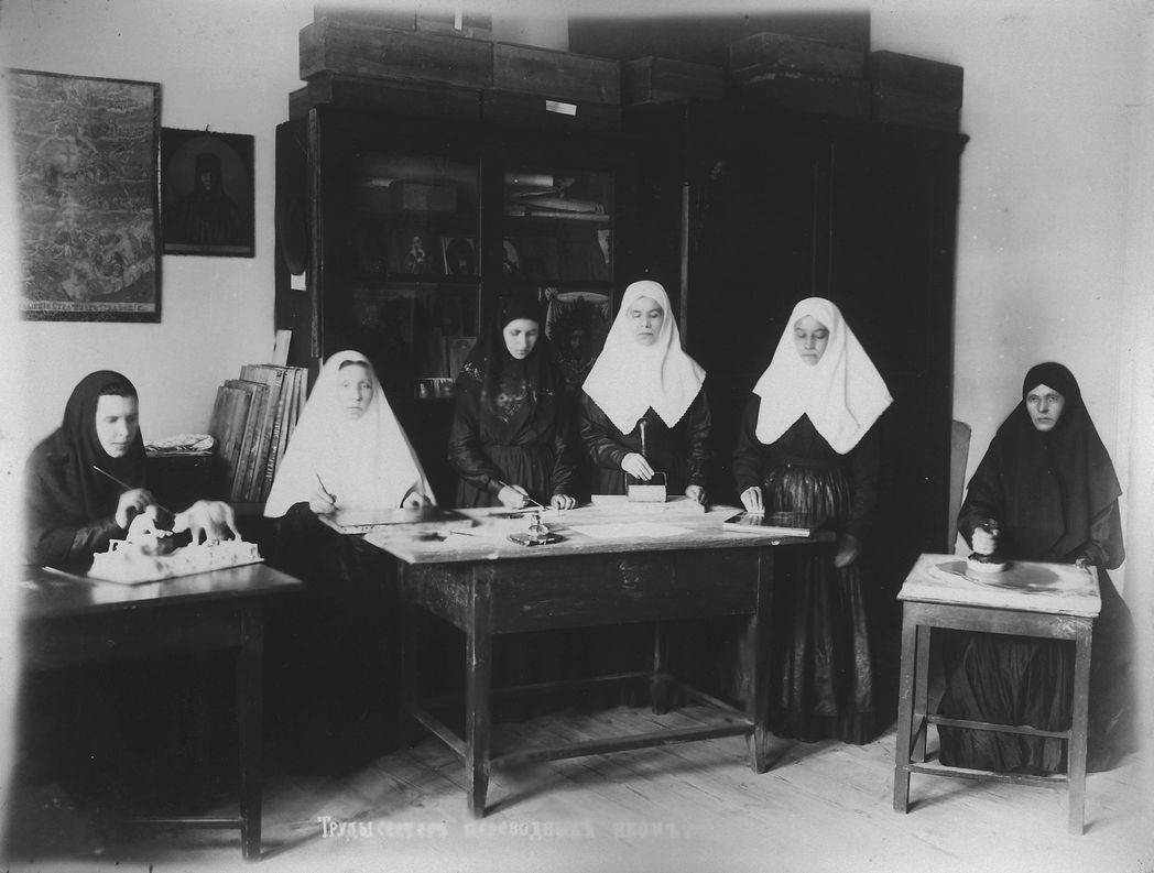 О том, как был организован труд в живописной мастерской, вспоминала монахиня Серафима (Булгакова): «Сестры жили по послушаниям. В корпусах обычно находились мастерские и жилые келии. Кто где работал, там и жил. В монастыре была большая живописная мастерская. В ней сестры не только писали иконы, но и заготовляли доски, золотили и чеканили. У каждой была своя специальность. В последнее время создали отдельную иконописную. Больше 80 сестер жили и работали в литографии. Сами работали на камнях (накалывали), по году подготовляли каждый камень. Печатали на моторе картины. Кроме того, переводили картины на белые грунтованные доски и затем их прописывали. Отливали из алебастра фигуры преподобного с медведем и раскрашивали. Делали всякие корзиночки, игрушки. Все это раздавали и продавали в монастырской лавке».