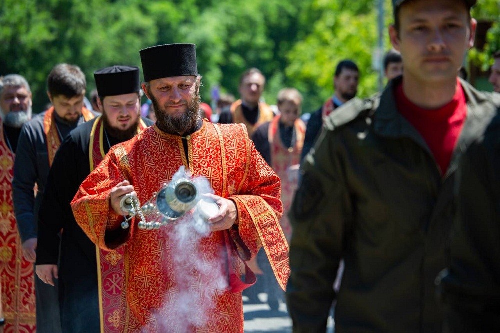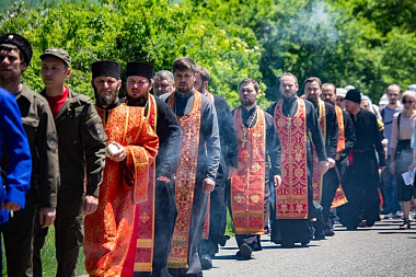 Завершился крестный ход кратким молебном на ступенях недавно возведенного Успенского собора монастыря и общей трапезой.