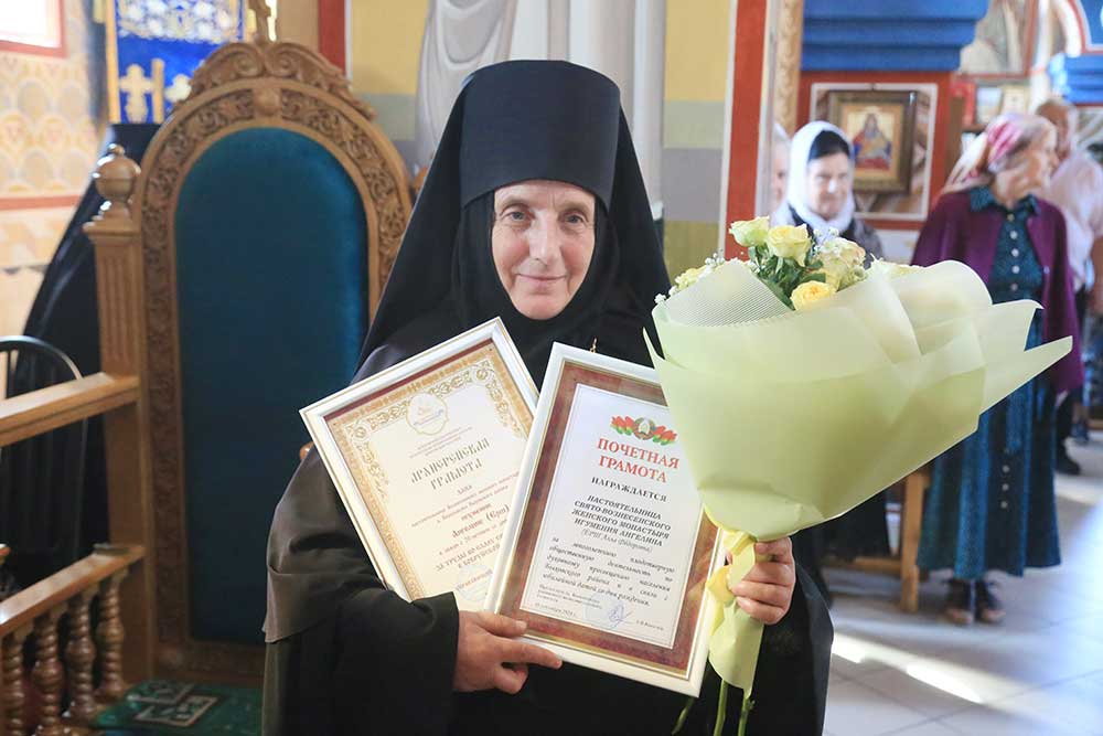 Игумению Ангелину поздравил также Александр Киселев, вручив ей букет белых роз и Почетную грамоту Быховского районного исполнительного комитета за многолетнюю и плодотворную общественную деятельность