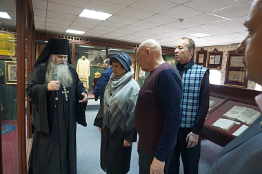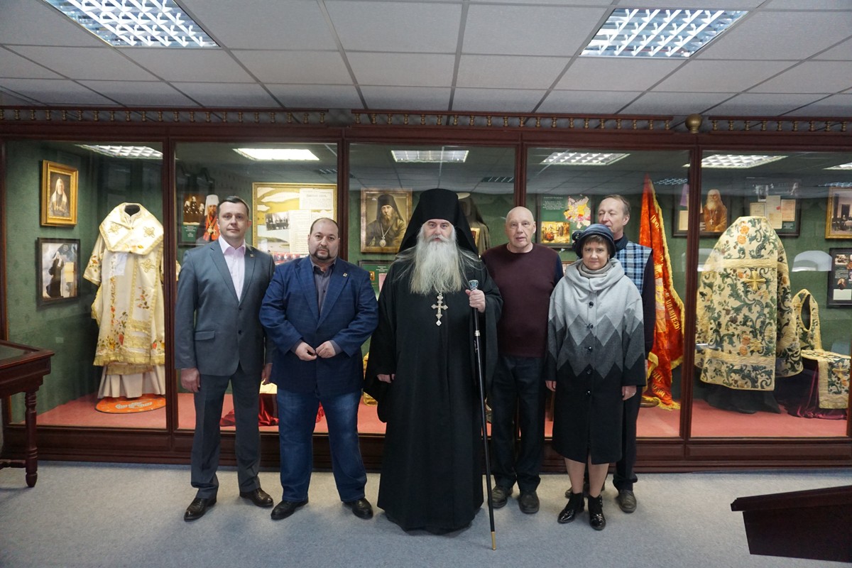Руководители благотворительного фонда «Возрождение культурного наследия», члены Московского областного отделения ИППО А.Н. Панин (заместитель председателя и член Совета отделения), С.Я. Ваксман и члены Нижегородского отделения Общества И.А. Малиновская, А.К. Малиновский, А.Н. Лушин и иеродиакон Евстафий (Поляков) внимательно ознакомились с экспозицией выставки.