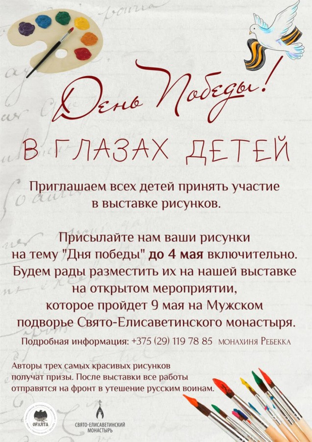 Елисаветинский женский монастырь в городе Минске приглашает всех детей принять участие в выставке рисунков на тему Дня Победы. Рисунки нужно присылать в монастырь до 4 мая включительно.