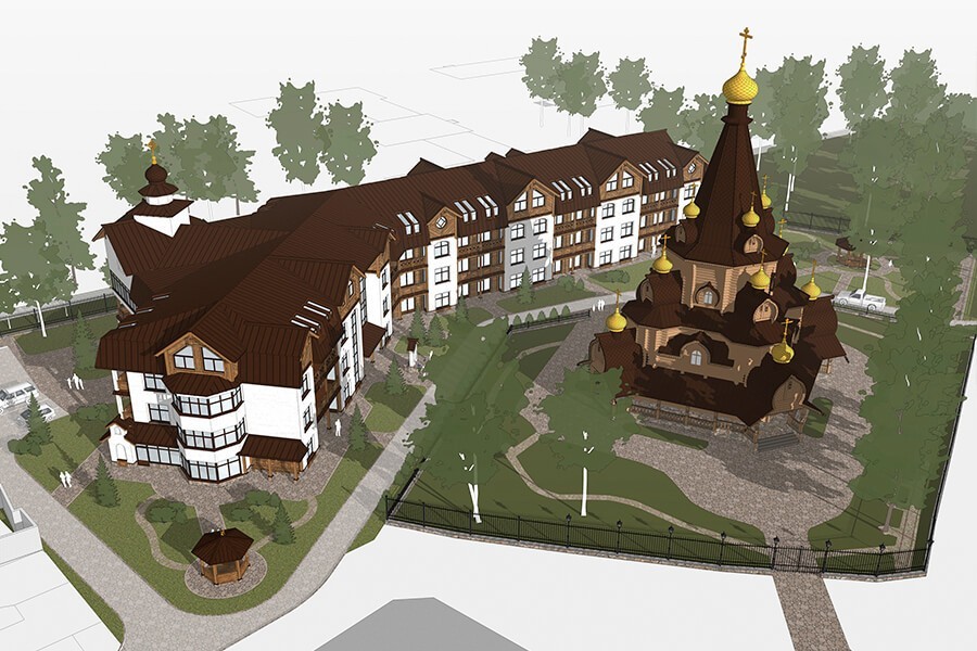 Монастырская богадельня расположится рядом с монастырем напротив храма в честь святителя Иоанна Шанхайского в трехэтажном здании с подвалом и мансардой. Насельники будут проживать на трех этажах в уютных комнатах с санузлами и душевыми. Окна всех комнат имеют лоджию с видом на храм.