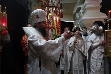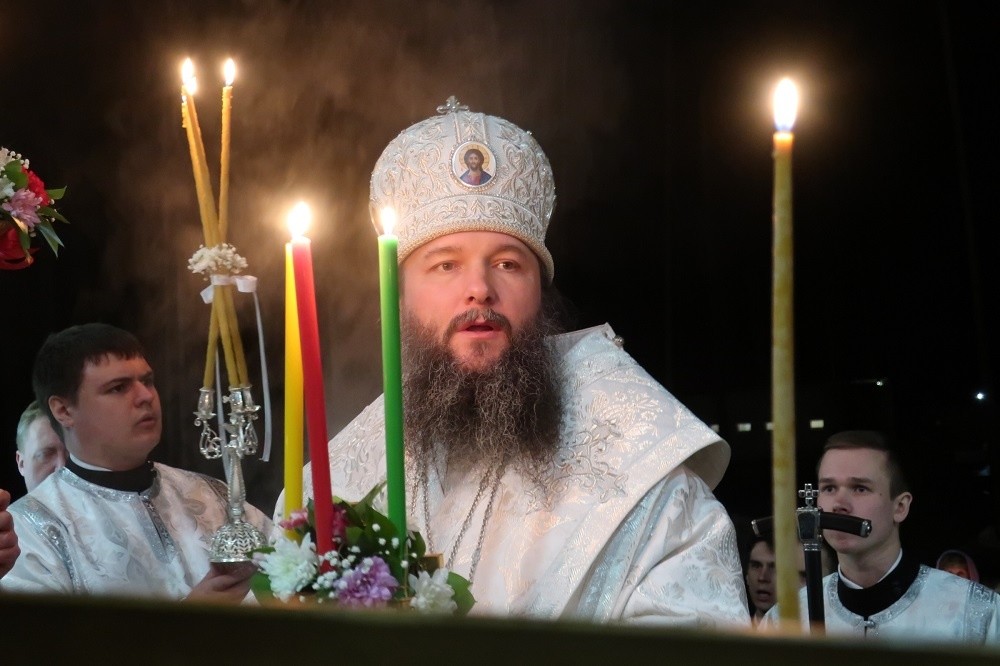Под пение стихиры «Воскресение Твое, Христе Спасе» вокруг собора был совершен крестный ход, который возглавил владыка Евгений.