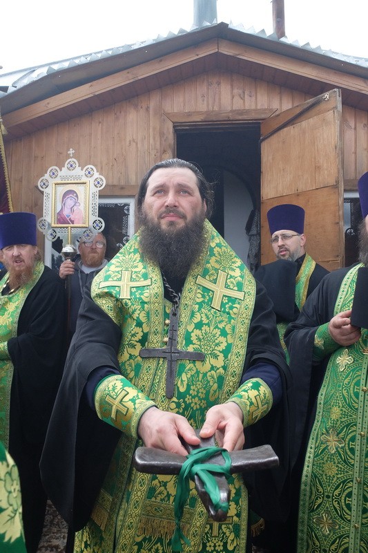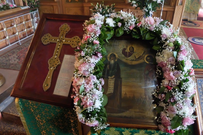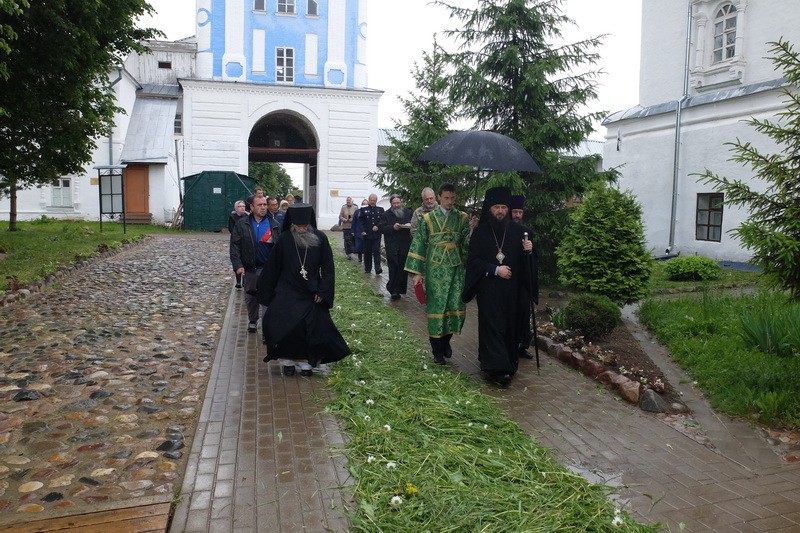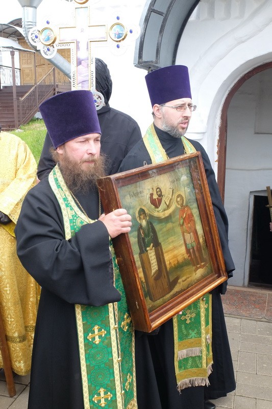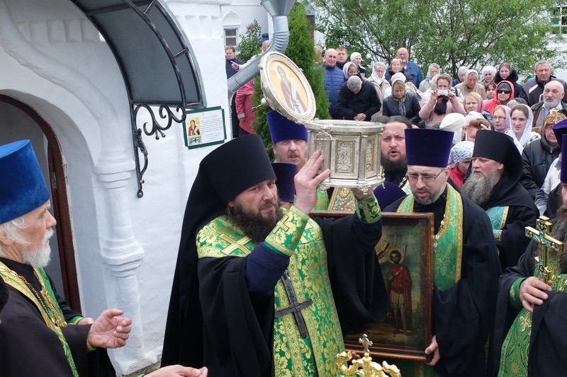 По окончании богослужения состоялся крестный ход по Никитской обители, затем он вышел за ее пределы и проследовал до святого источника преподобного Никиты Столпника, где состоялось освящение воды. Владыка Феодор весь путь нес на себе вериги прп. Никиты – святые реликвии, исцеляющие тех, кто поклоняется им с верой, – и на источнике осенял молящихся его крестом, являющимся частью вериг.
