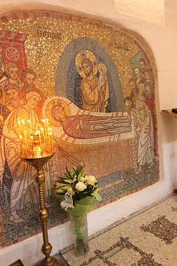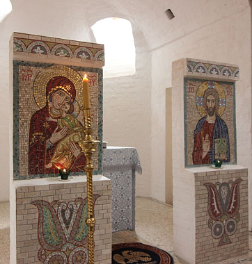 Храм построен наподобие пещер Киево-Печерской Лавры, где подвизались первоначальники русского монашества Антоний и Феодосий. Только получился он не совсем под землей, так как из-под храма бьет источник, который выведен за стеной монастыря и освящен в честь этих святых. Храм оформляется мозаикой в стиле первых веков христианства. Смысловая идея храмового интерьера – передать простоту и вместе с тем монументальность, ощущение аскетического духа и величие православной веры.