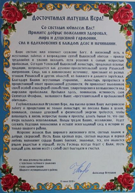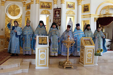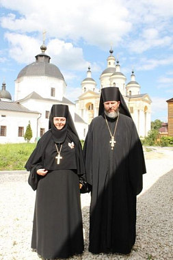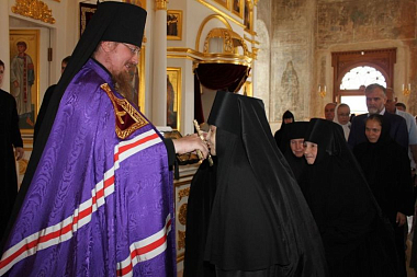 В завершение Преосвященный владыка поздравил настоятельницу монастыря игумению Веру (Ровчан) с 60-летним юбилеем и преподнес ей букет цветов и памятный подарок – икону Пресвятой Богородицы.