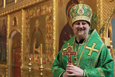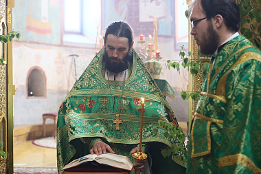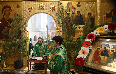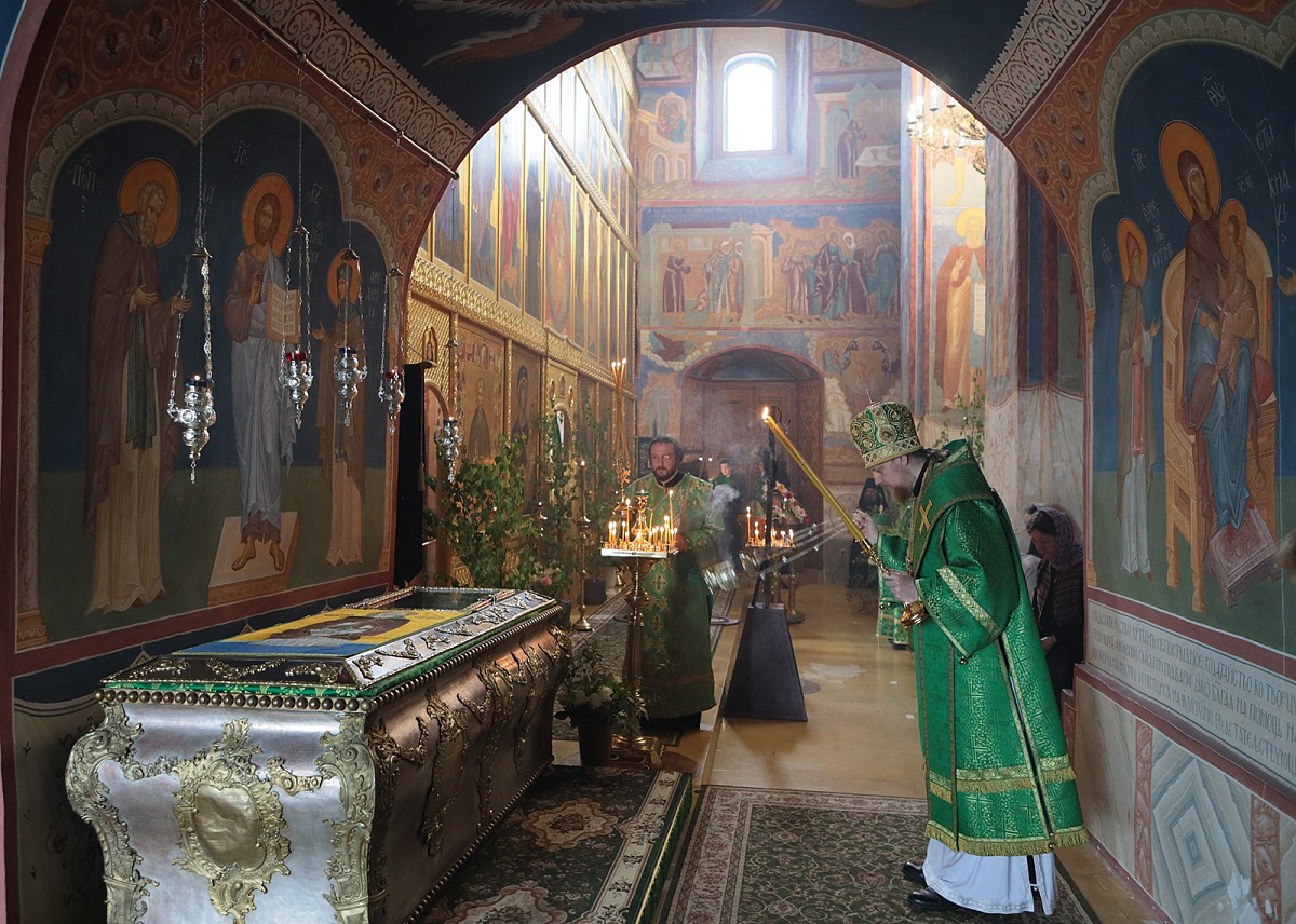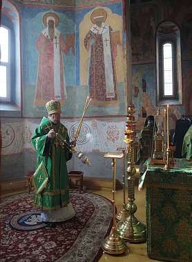 В Троицком соборе монастыря. Его Преосвященству сослужили настоятель обители игумен Пантелеимон (Королев) с братией в священном сане.