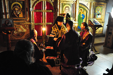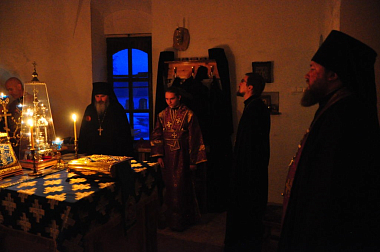 В алтаре молились насельники в духовном сане, священники и диаконы.