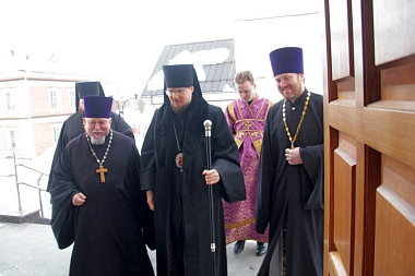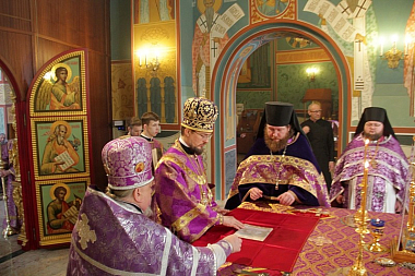 Его Преосвященству сослужили: секретарь епархии, настоятель собора протоиерей Александр Куликов; ключарь собора протоиерей Олег Кочубей; иеромонах Иов (Чернышев); руководитель Службы протокола иерей Сергий Бондарь; иеромонах Геронтий (Чудневич); руководитель Административного секретариата епархии иеромонах Марк (Шляхтин).