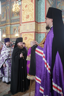 На малом входе правящий архиерей возвел иеромонаха Иова (Чернышева) в сан игумена Свято-Троицкого Филиппо-Ирапского мужского монастыря в пос. Зеленый Берег Кадуйского района.