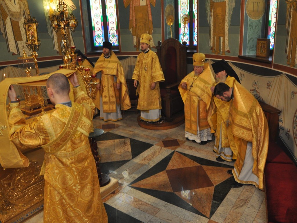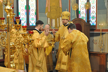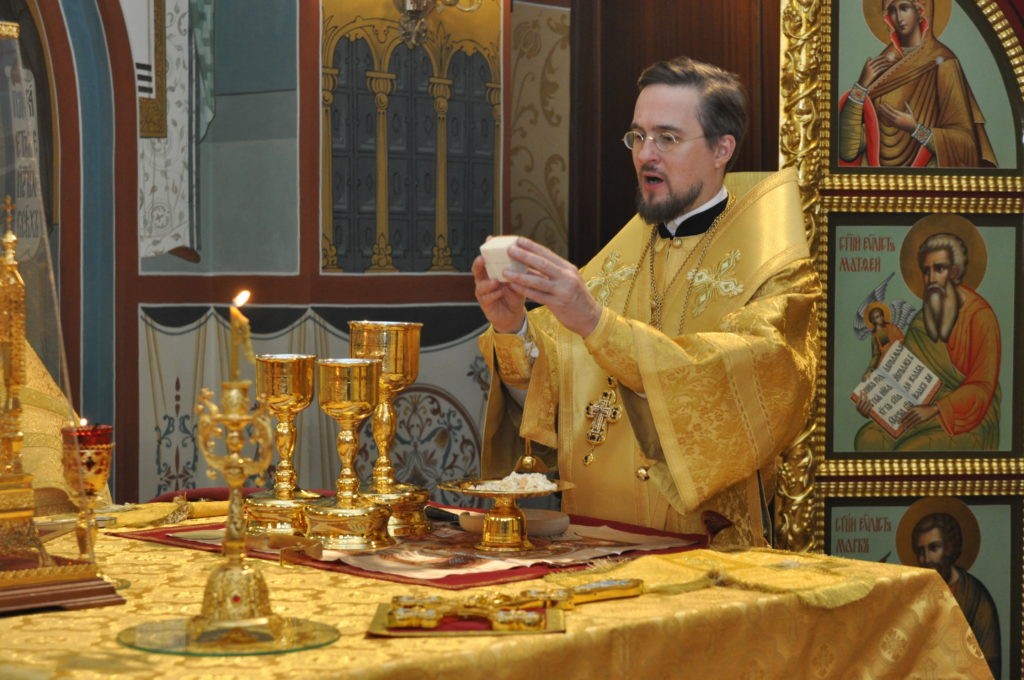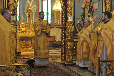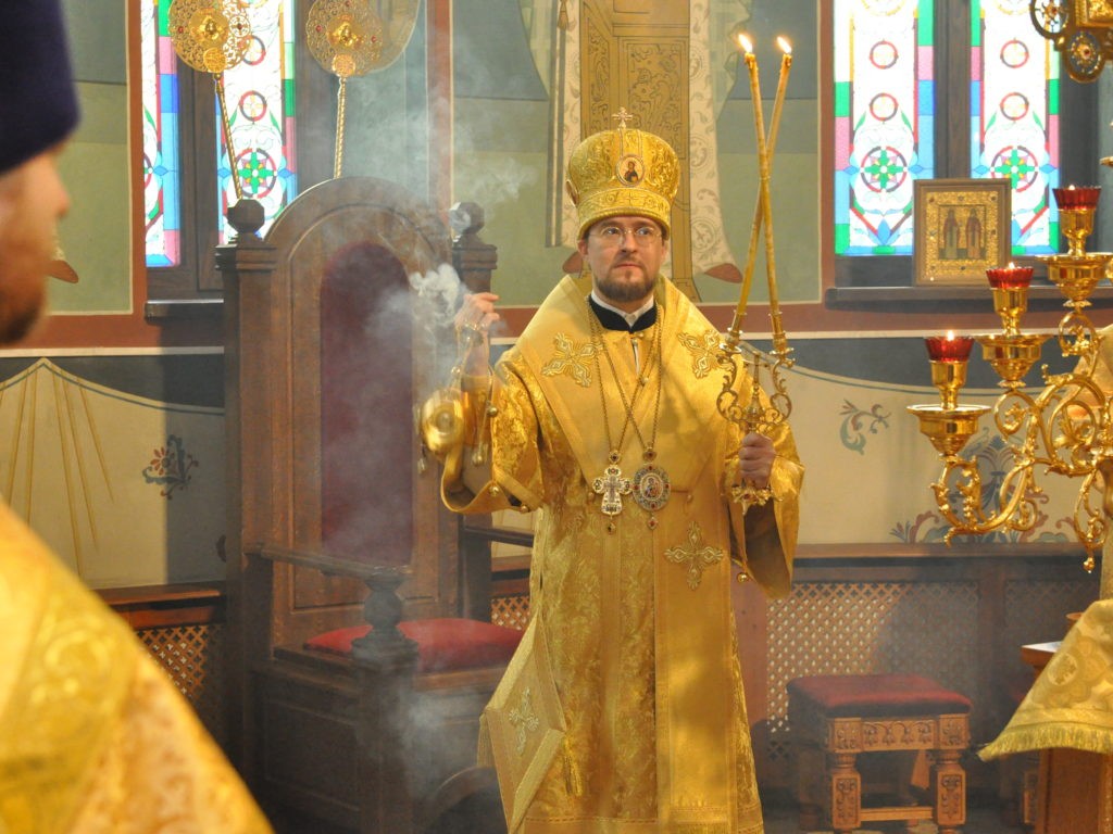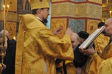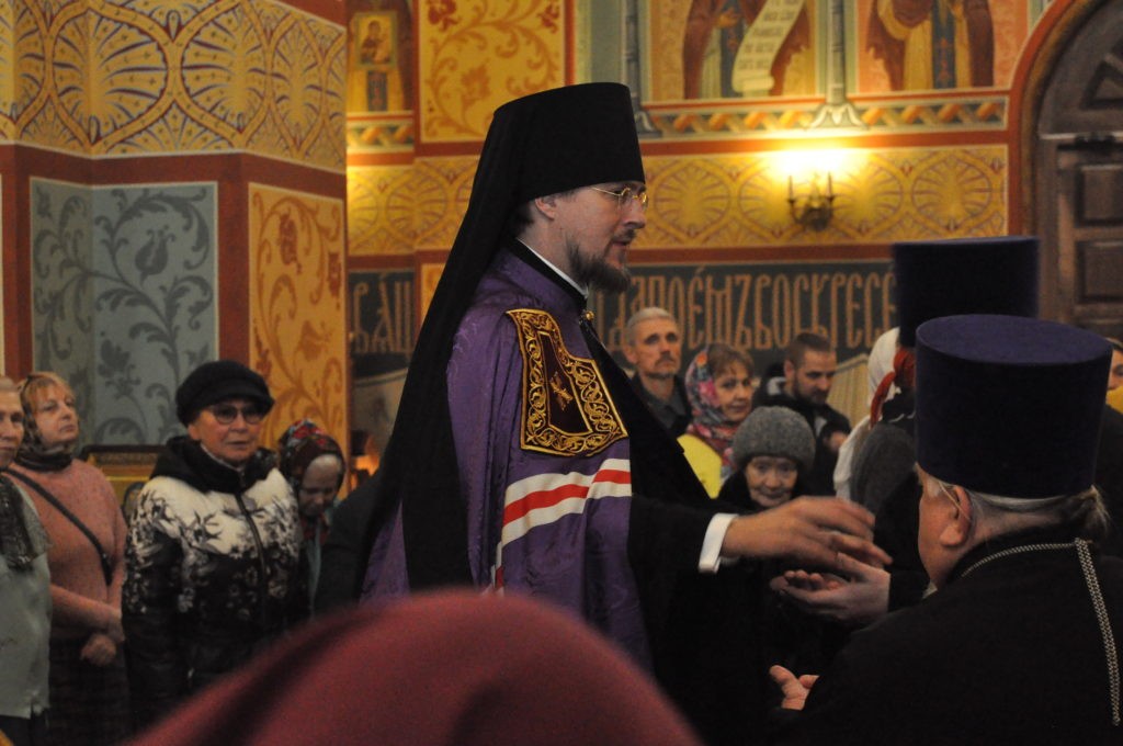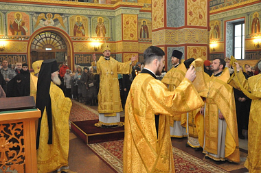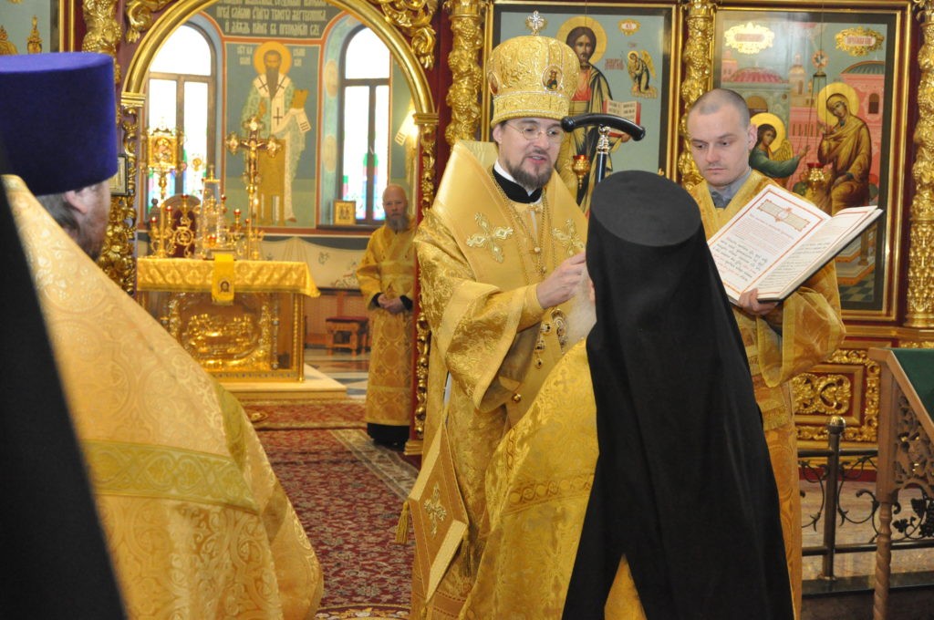 За Литургией Его Преосвященство совершил чин возведения иеромонаха Феодосия (Белова) в сан игумена мужского монастыря Троице-Благовещенская Евфросино-Синоезерская пустынь.