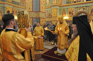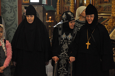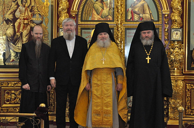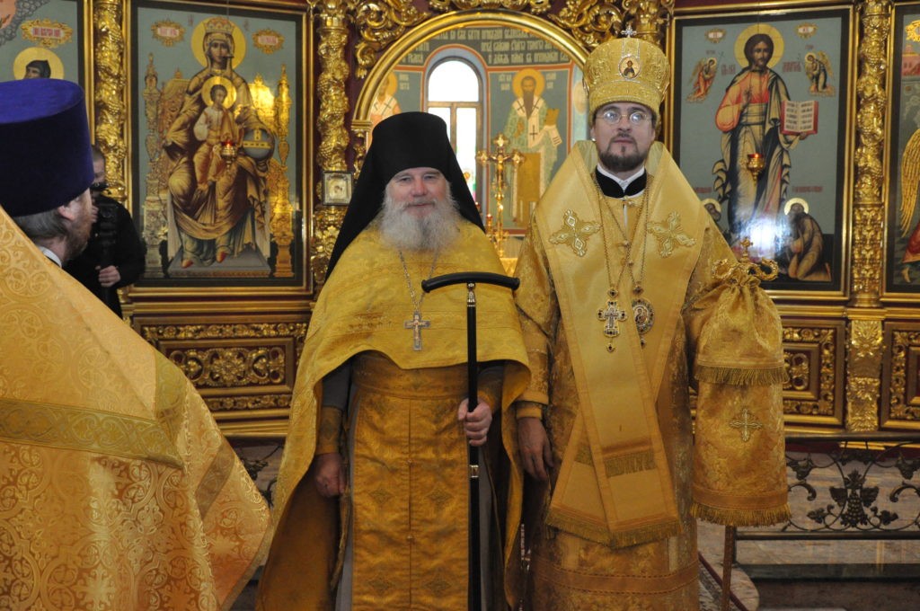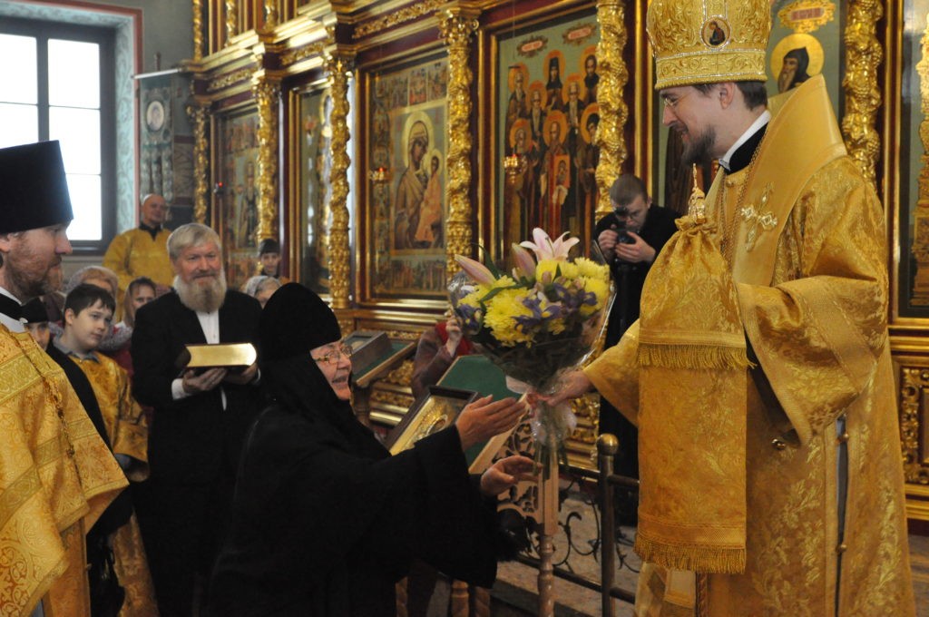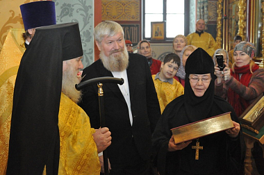 В завершение владыка Флавиан, настоятельница Ново-Леушинского женского монастыря игумения Кирилла (Червова), многочисленные гости и духовные чада поздравили игумена Феодосия с высоким назначением.