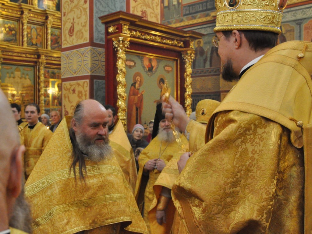 По окончании богослужения Преосвященный вручил игумену Феодосию (Белову) игуменский жезл.