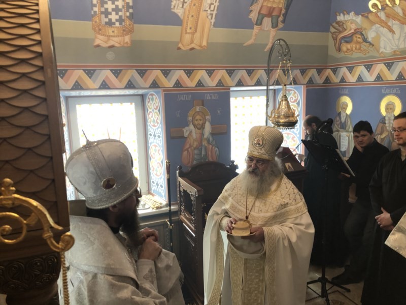 По окончании богослужения епископа Игнатия приветствовал наместник обители архимандрит Василий. Отец наместник преподнес владыке заздравную просфору и в память об освящении храма – посох.