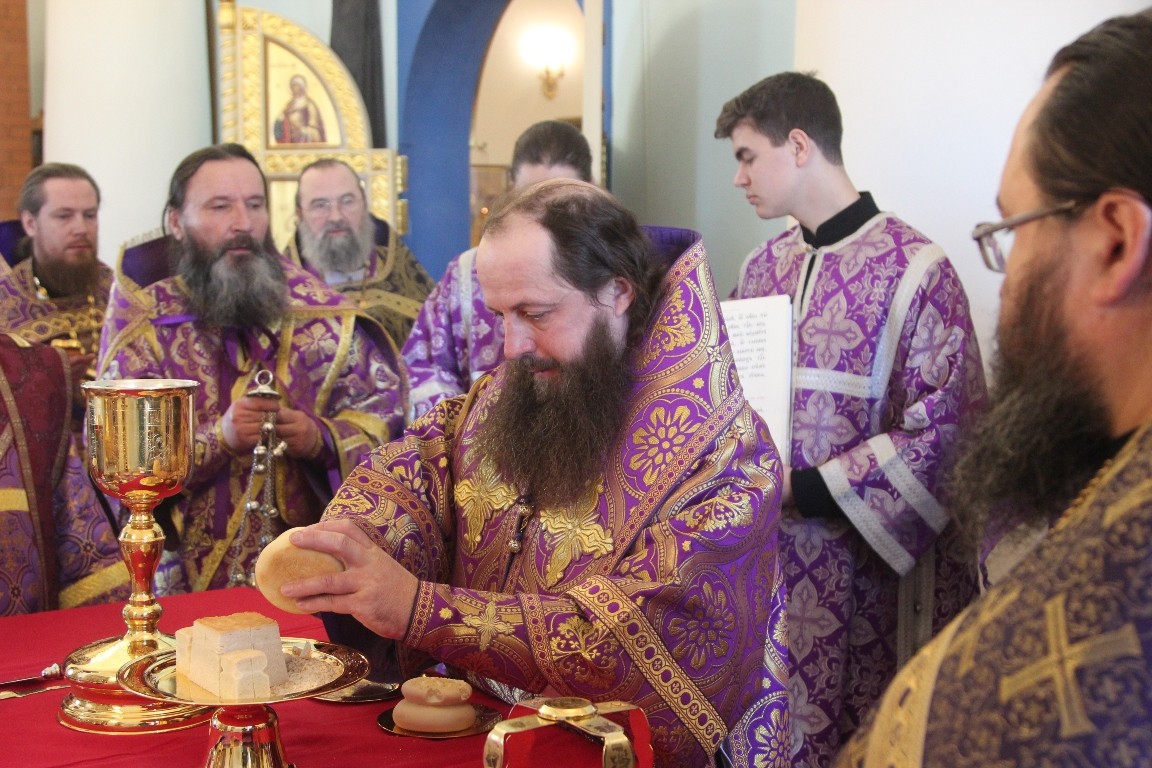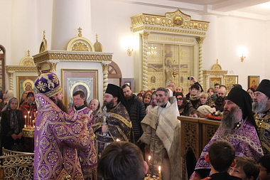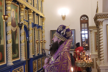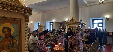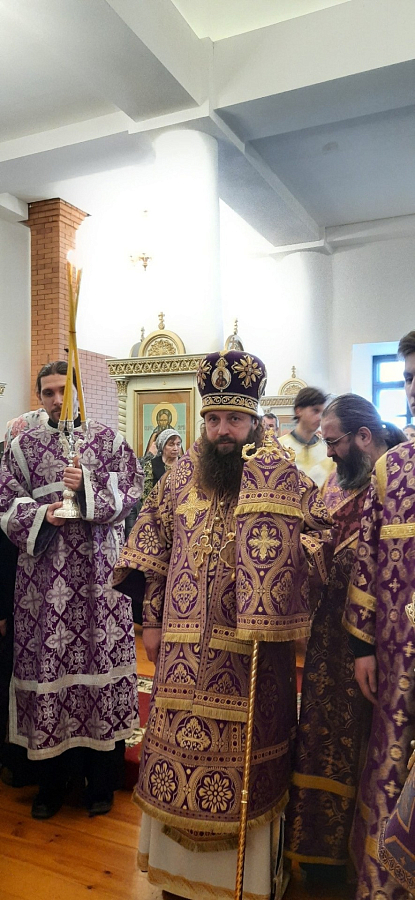 В Покровском храме обители Его Преосвященству сослужили наместник Николо-Шартомского монастыря архимандрит Филипп (Понамарчук), игумен монастыря Животворящего Креста Господня игумен Гавриил (Лысов) с братией обители в священном сане.