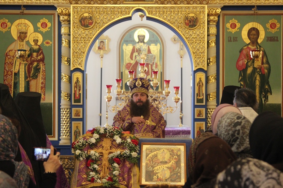 «Поздравляю вас с Неделей Крестопоклонной и памятью сорока мучеников Севастийских. Те праздники, которые связаны с Крестом Господним, являются престольными праздниками этого монастыря, потому что именно это место было освящено схождением Животворящего Креста, и с тех пор оно находится под особой благодатью Креста Господня. Сегодня мы празднуем тоже Крестопоклонный праздник, Крест Господень выносится на середину в середине Четыредесятницы, чтобы укрепить наши немощные силы. Нет того человека, который бы нес Крест Господень, не изнемогая, и мы понимаем, что своими силами человек Крест Господень не донесет. Ему нужно всегда черпать силы у Господа, у Животворящего Креста Господня, тогда и личное крестоношение меняется – человек получает силы, чтобы продолжить свой жизненный спасительный путь.