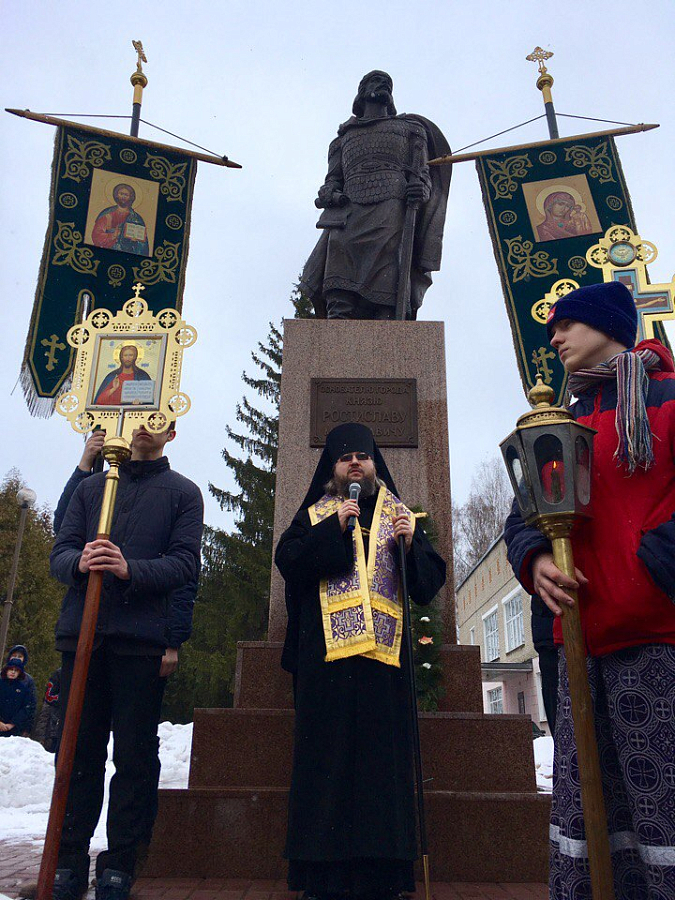 В завершение состоялся крестный ход к памятнику святого благоверного великого князя Ростислава, в котором приняли участие епископ Мелетий, духовенство и клирики епархии, учащиеся Православной гимназии г. Рославля, прихожане монастыря и паломники.