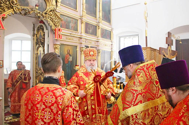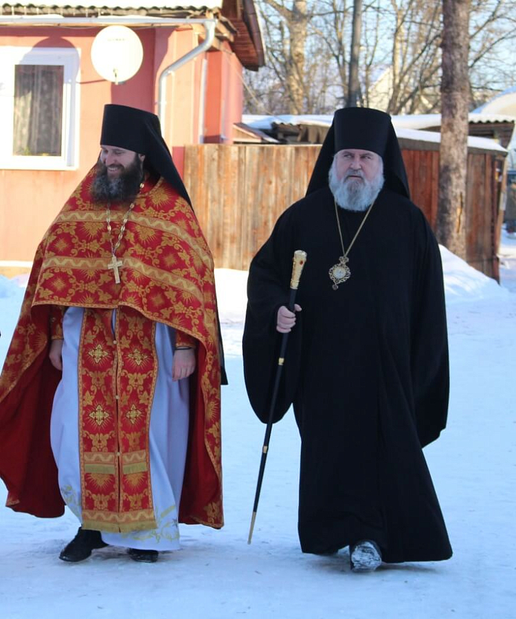 Его Преосвященству сослужили: секретарь Вяземской епархии протоиерей Валерий Калинин; настоятель Свято-Владимирского мужского монастыря на истоке Днепра игумен Амвросий (Федукович); настоятель храма в честь Казанской иконы Божией Матери г. Гагарина протоиерей Владимир Титов; клирик Благовещенского собора г. Гагарина иерей Роман Ступа; клирик Тихвинского Смоленского подворья Свято-Владимирского монастыря иеромонах Аркадий (Чугунов); клирик Вознесенского подворья Свято-Владимирского мужского монстыря иеромонах Сампсон (Горбатенко).