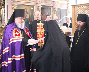 У Святых врат Преосвященного владыку Сергия встречал настоятель Свято-Владимирского мужского монастыря на истоке Днепра игумен Амвросий (Федукович).