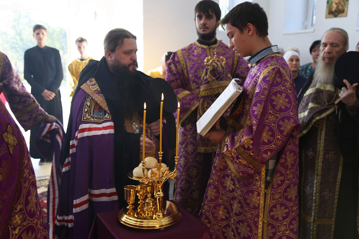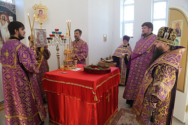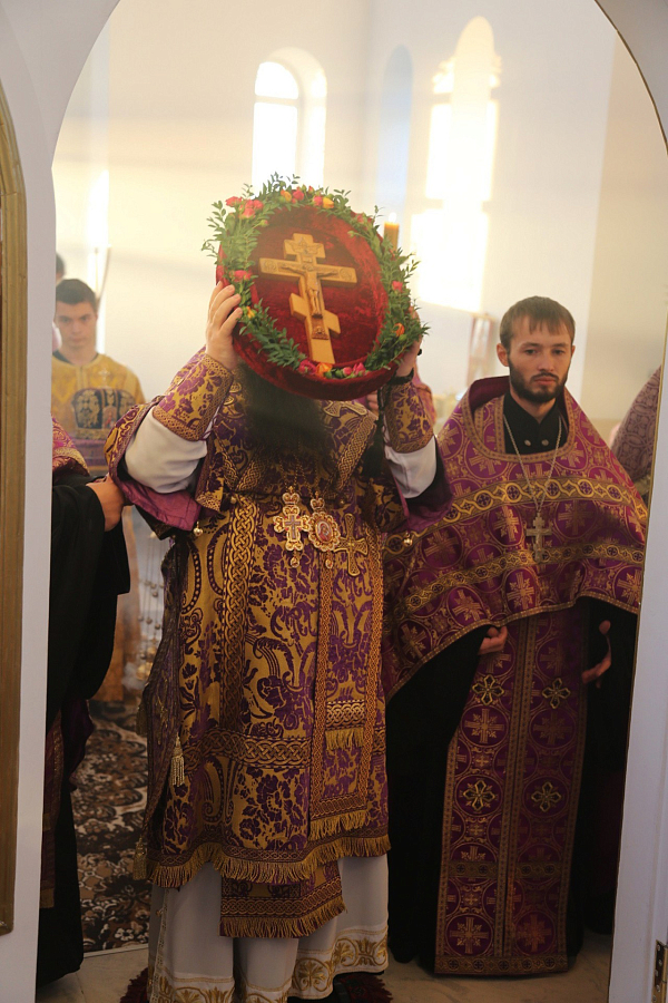 Накануне вечером правящий архиерей отслужил в монастырском храме всенощное бдение, за которым после великого славословия из алтаря в центр храма был изнесен Крест.