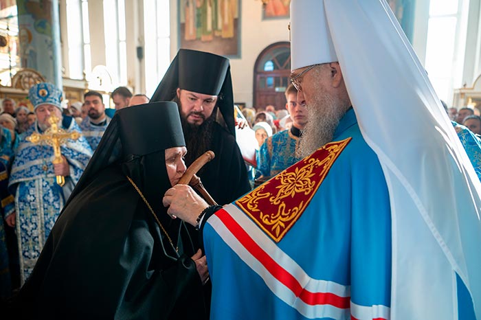 После прочтения молитв иерарх возложил на настоятельницу монастыря наперсный крест и вручил ей игуменский посох. Глава Казахстанского митрополичьего округа также обратился к матушке Нике с напутственным словом.