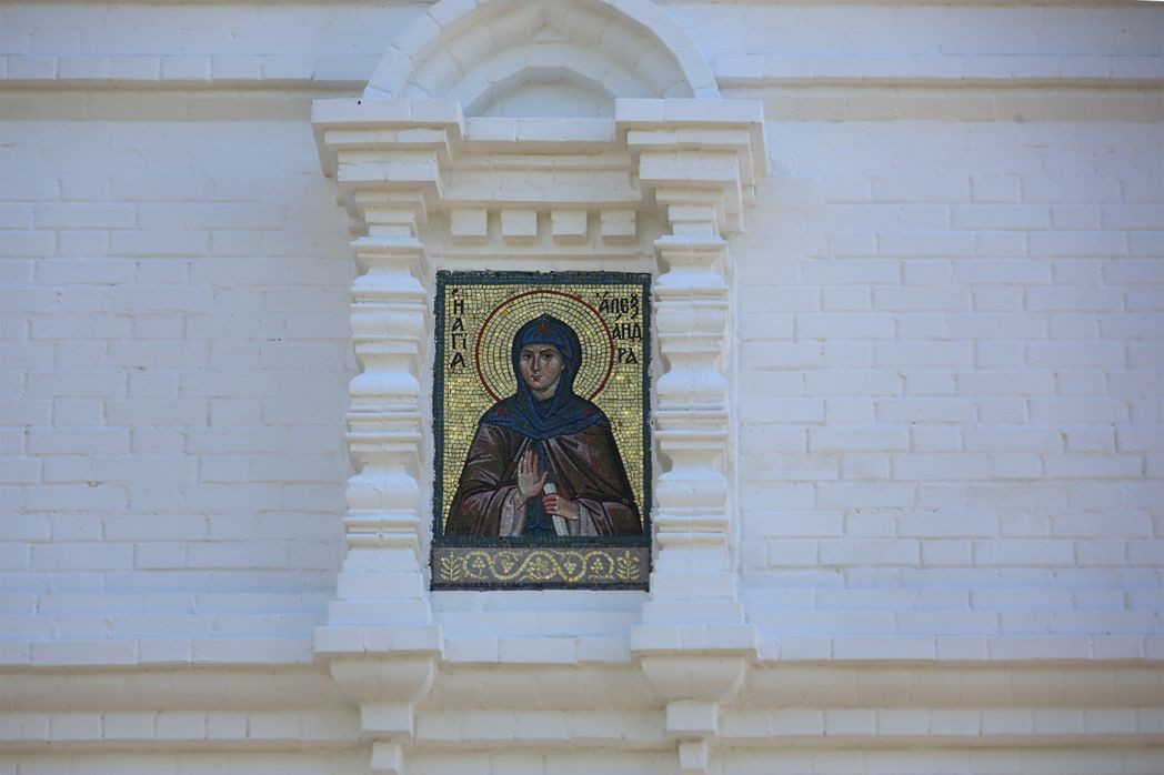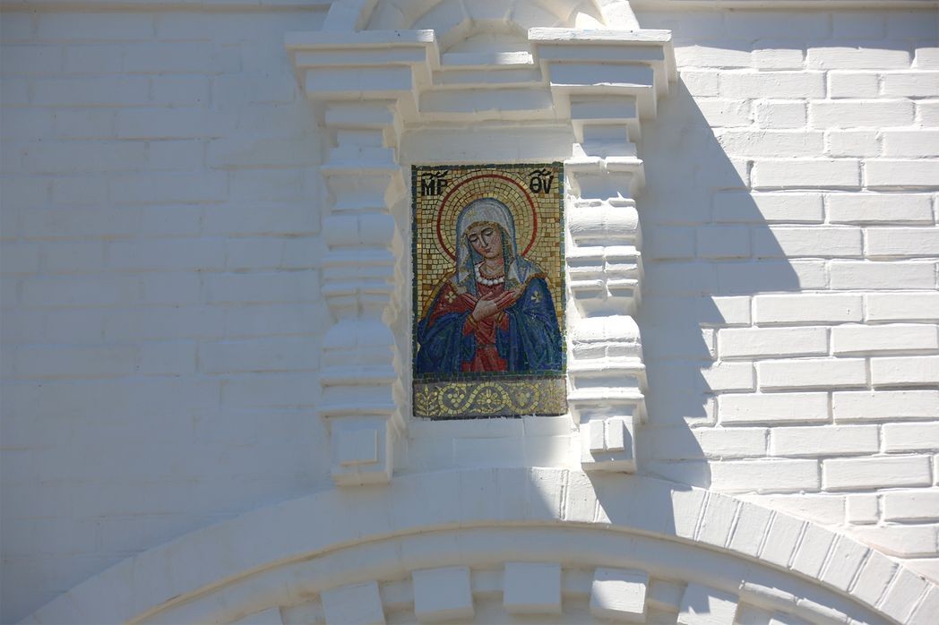 В мозаике выполнены и иконы, которые увенчают арки с двух сторон. При входе в обитель на вратах располагается образ «Спас Нерукотворный», икона преподобного Серафима Саровского и икона Божией Матери «Умиление». На выходе — образы преподобных жен Дивеевских.