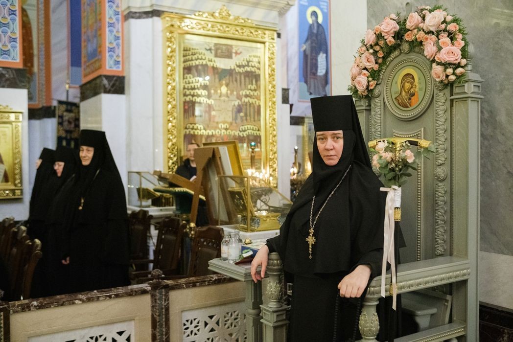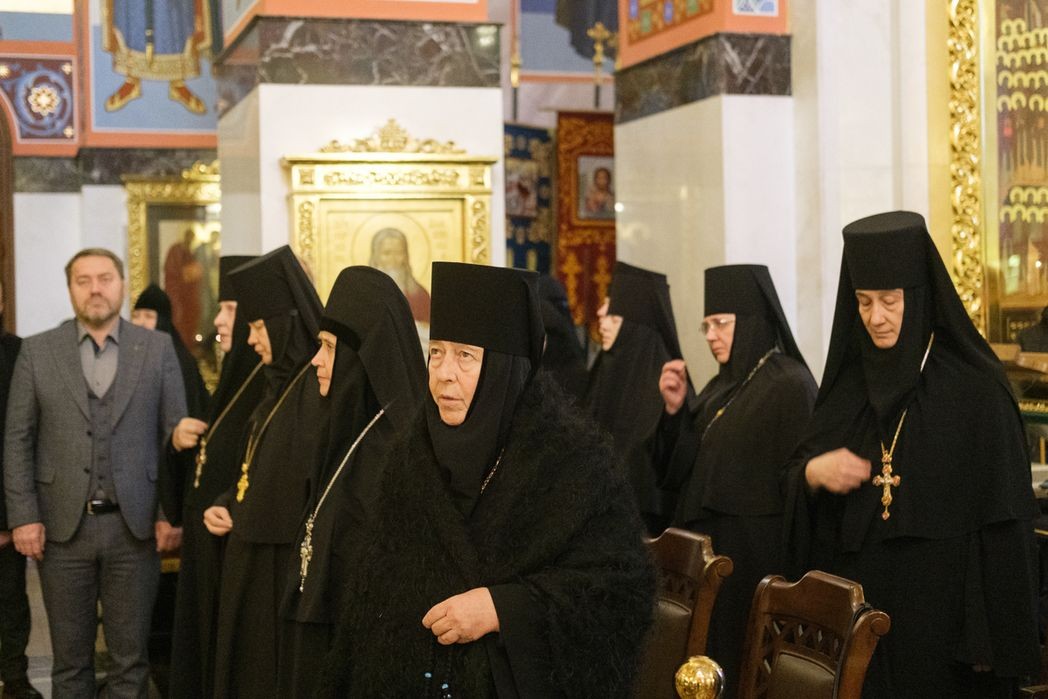 За богослужением молились настоятельница Воскресенского Новодевичьего монастыря игумения София (Силина) с сестрами, заместитель председателя Синодального отдела по монастырям и монашеству, настоятельница Зачатьевского ставропигиального монастыря г. Москвы игумения Иулиания (Каледа), настоятельница Иоанновского ставропигиального монастыря г. Санкт-Петербурга игумения Людмила (Волошина) настоятельница Введенского Толгского монастыря г. Ярославля игумения Варвара (Третьяк), настоятельница Константино-Еленинского женского монастыря п. Ленинское Выборгского района игумения Илариона (Феоктистова), учащиеся Свято-Владимирской школы при обители.
