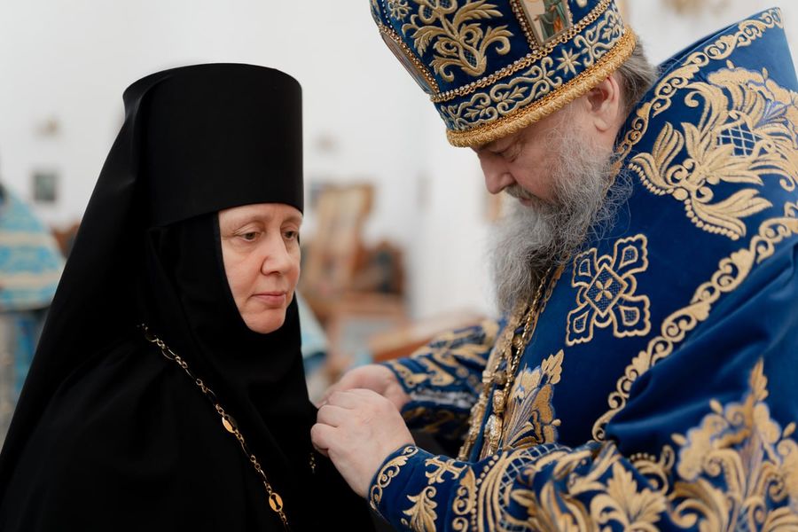 По окончании Божественной литургии архиепископ Гурий поздравил игумению Дарию с грядущим 70-летием со дня рождения и удостоил ее медали преподобномученика Серафима Жировичского I степени.