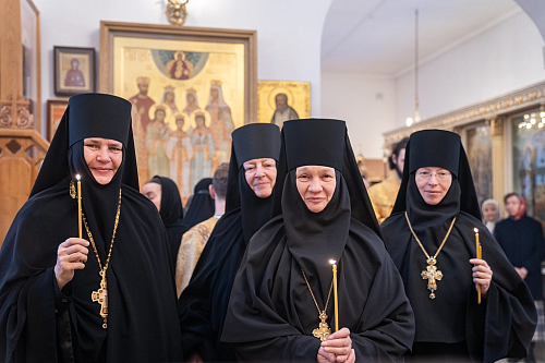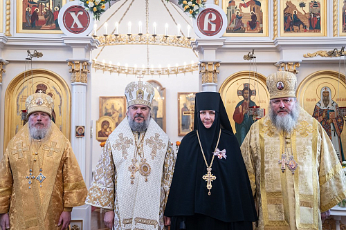 По окончании Литургии настоятельница монастыря игумения Варвара поблагодарила архипастырей за посещение обители в праздничный день и преподнесла им памятные подарки.