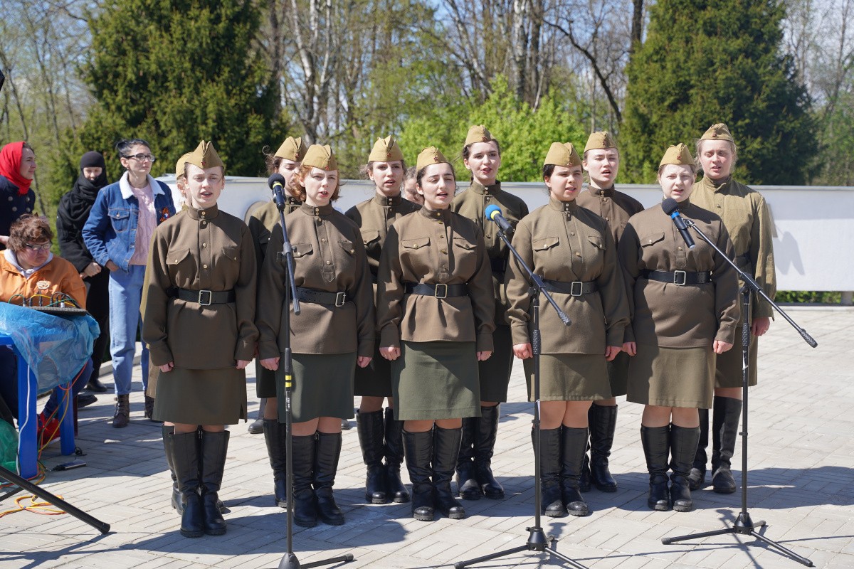 Хор «Отрада» исполнил песни «Седые головы» и «Кино идет, воюет взвод. Счастливый май». Девочки также приняли участие в возложении цветов к памятнику защитникам Ильинских рубежей и сфотографировались на память с участниками памятного церемониала.