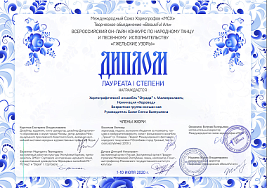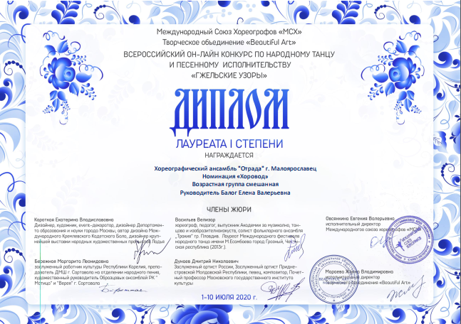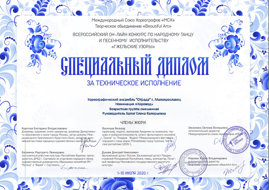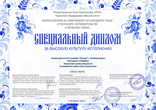 За свое выступление, представленное в номинации «Хоровод» на конкурсе «Гжельские узоры», хореографический ансамбль «Отрада» получил четыре награды – диплом лауреатов I степени и три специальных диплома жюри: «За сохранение наследия русского танца», «За высокую культуру исполнения» и «За техническое исполнение».