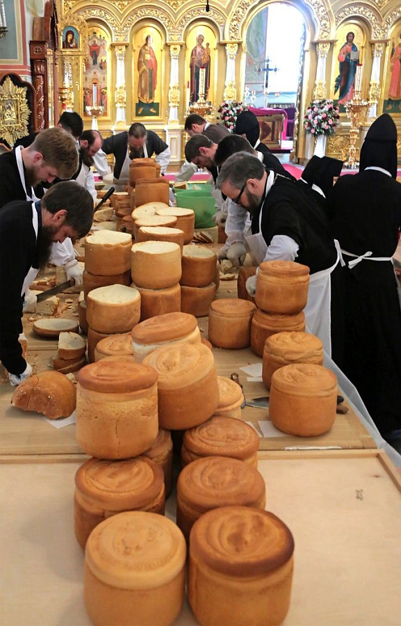 Всю Светлую седмицу на солее у отверстых царских врат во всех храмах Серафимо-Дивеевского монастыря стояли артосы. Каждый день по окончании Божественной литургии с ними совершались торжественные пасхальные крестные ходы по святой Канавке. Сегодня в Преображенском соборе перед вечерним богослужением клирики и сестры обители приступили к их раздроблению и упаковке.