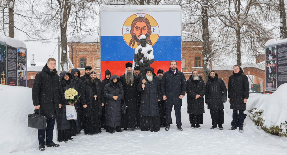 На площади перед монастырем гостей встретили настоятель игумен Сергий (Куксов) и глава муниципального Чеховского округа М.Н. Собакин. Возле памятника «Бойцам спецназа – солдатам России» игумен Сергий рассказал гостям об истории памятника.
