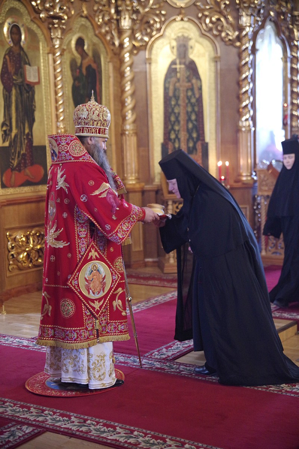 По окончании Литургии настоятельница монастыря выразила управляющему епархией благодарность за визит, совершенное богослужение и архипастырскую заботу об обители. Игумения Сергия преподнесла митрополиту Георгию заздравную просфору.