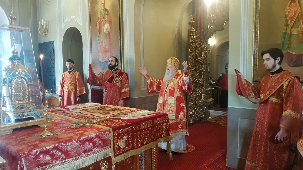 После сугубой ектении архиерей вознес молитву, чтомую во время распространения вредоносного поветрия, а после заупокойной ектении – молитву о приснопамятном тезоименитом митрополите Никодиме (Ротове) и новопреставленной Ольге Куликовской-Романовой.