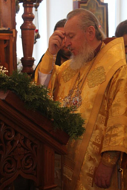 Его Высокопреосвященству сослужили благочинный монастырей Брянской епархии игумен Даниил (Цупиков), наместник Свенского Свято-Успенского мужского монастыря игумен Алексий (Тюрин), настоятель Богородицкой Площанской пустыни игумен Леонид (Лушкин), настоятель Бело-Бережской Иоанно-Предтеченской пустыни игумен Глеб (Шматов), настоятель Никольского храма пос. Николо-Прозорова Мытищинского района игумен Платон (Кисурин) (Московская епархия), и.о. настоятеля Карачевского Воскресенского монастыря иеромонах Алексий (Долгачев).