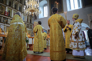 Его Высокопреосвященству сослужили благочинный монастырей Тульской епархии игумен Агафангел (Болдин) и иерей Аркадий Елькин.