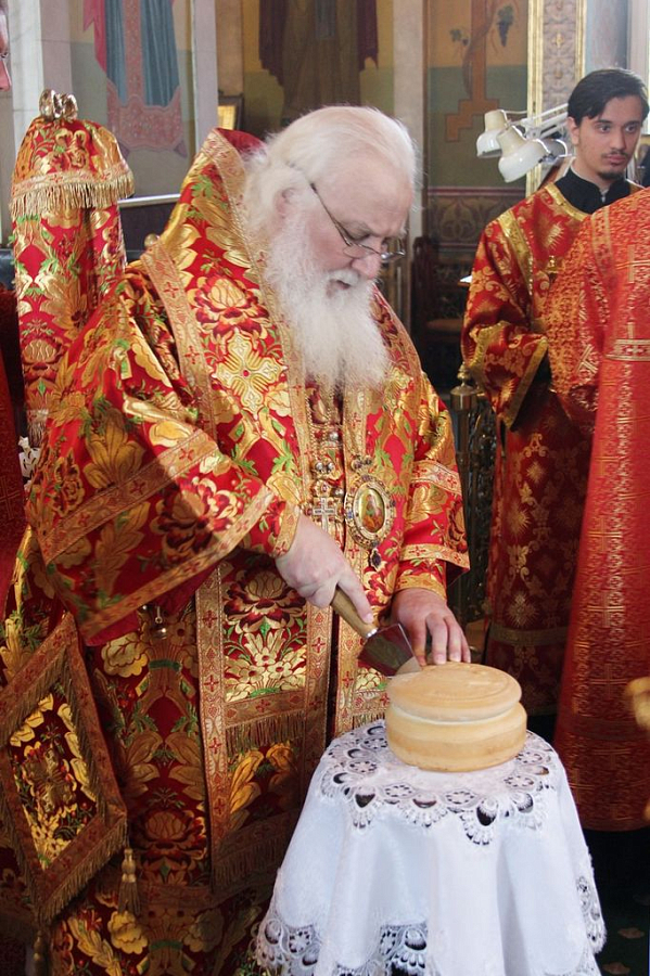По заамвонной молитве владыка митрополит прочитал молитву на раздробление артоса.