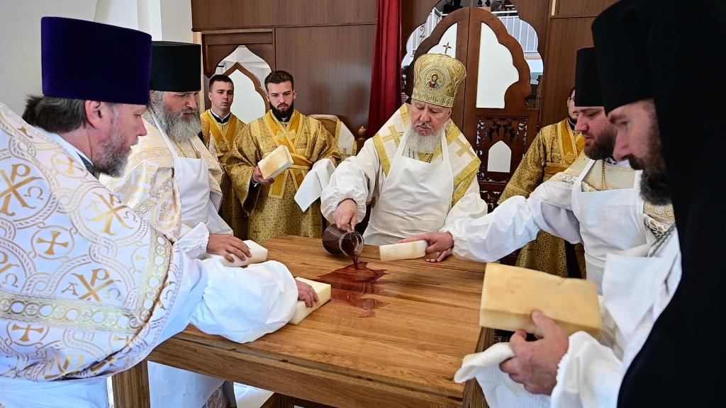 После Литургии владыка Александр познакомился с ходом восстановительных работ Преображенского храма и осмотрел хозяйственную часть обители.