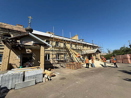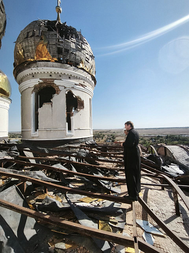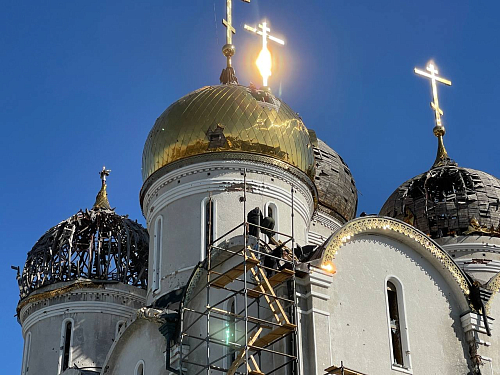 Митрополит Владимир лично обошел территорию обители, осмотрел степень разрушений и уже проведенные работы. Владыка поднялся на кровлю Свято-Успенского собора, чтобы на месте оценить масштаб предстоящих задач.