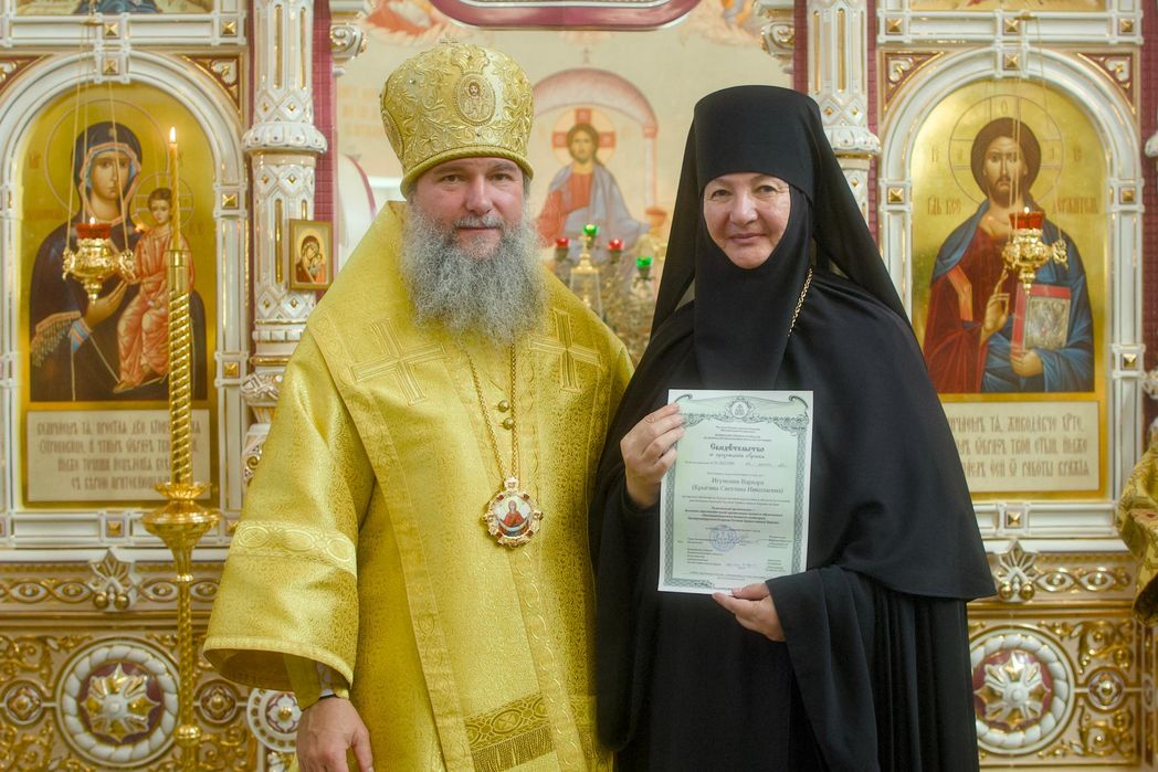 В этот день глава митрополии владыка Евгений вручил свидетельства о завершении курсов базовой подготовки в области богословия для монашествующих Русской Православной Церкви настоятельнице Благовещенского Борисоглебского женского монастыря поселка Краснояр игумении Варваре (Крыгиной), монахиням обители Нине (Крыгиной), Матроне (Машкинцевой), Феодосии (Борисовой), инокине Марии (Бондар). Сестры прошли обучение на базе Екатеринбургской духовной семинарии.