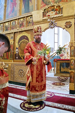 Молящиеся совершили славление святым Кириллу и Мефодию у празднично украшенной иконы. Затем прошли крестным ходом вокруг храма, и владыка Григорий окропил храм и территорию святой водой.