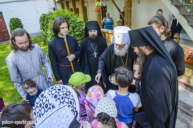 В завершение владыку митрополита с праздником Светлого Христова Воскресения поздравили преподаватели и учащиеся Воскресной школы храма Святых жен-мироносиц г. Пскова во главе с настоятелем священником Александром Николаевым. Псковский архипастырь поздравил детей с праздником и вручил им сладкие подарки.
