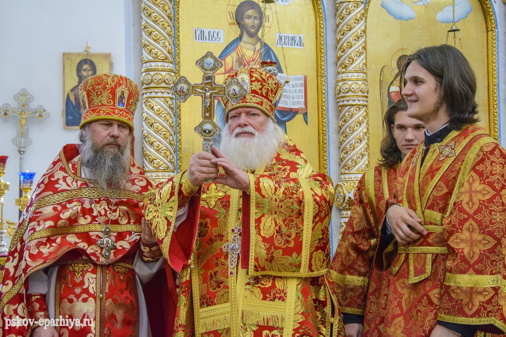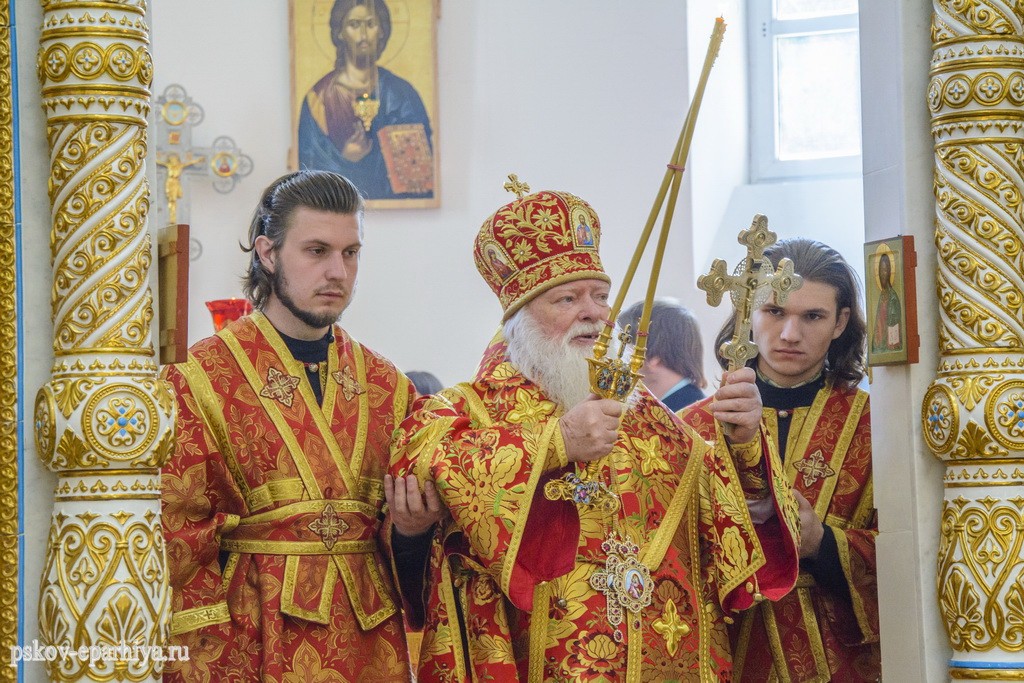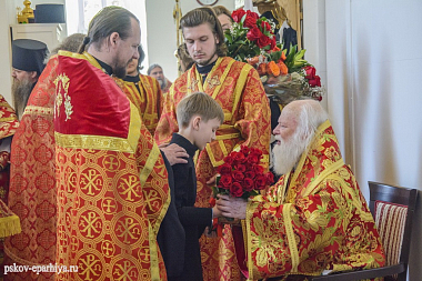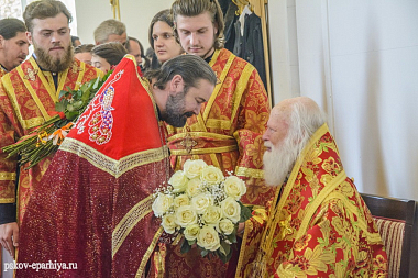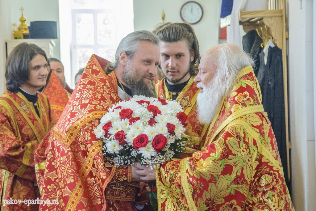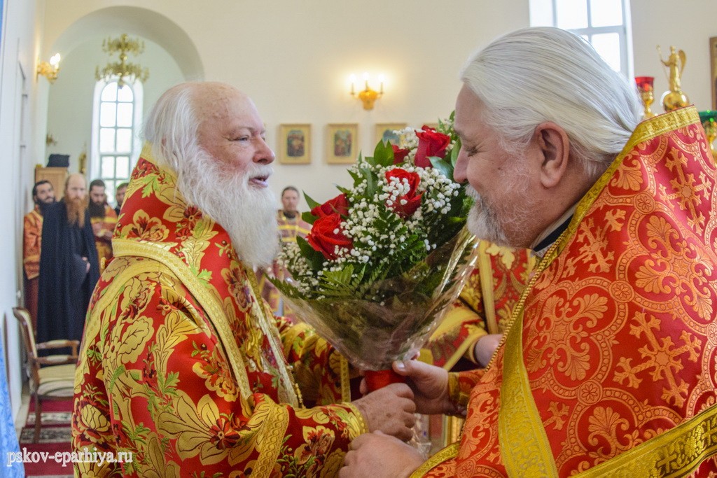Его Высокопреосвященству сослужили епископ Гдовский Фома, викарий Псковской епархии, наместники монастырей митрополии, руководители епархиальных отделов, благочинные церковных округов, настоятели и клирики храмов Псковской митрополии.