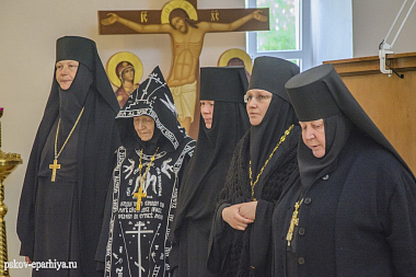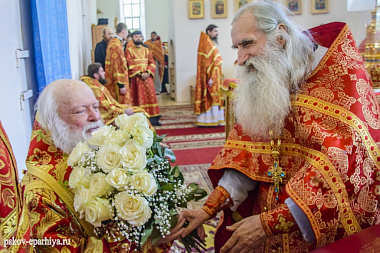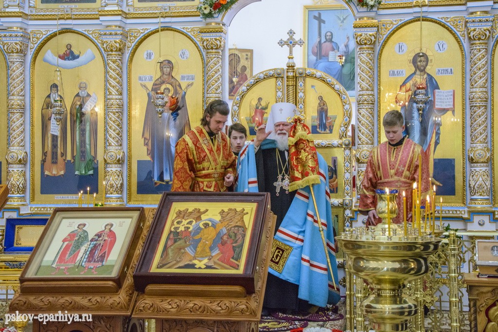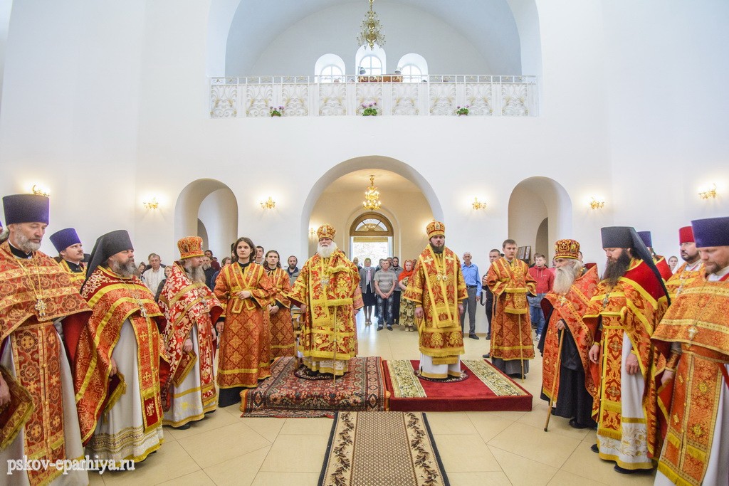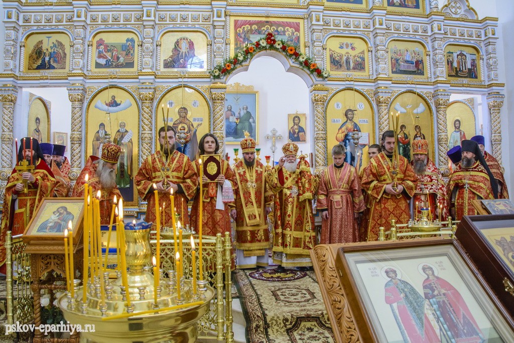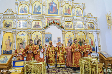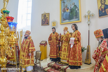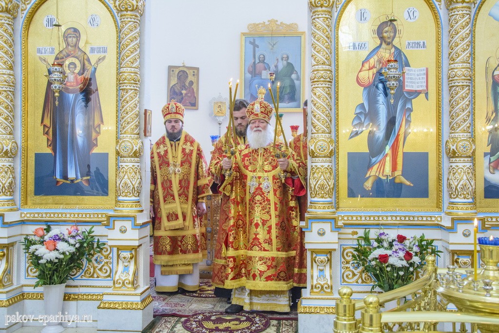 Его Высокопреосвященству сослужили епископ Гдовский Фома, викарий Псковской епархии, наместники монастырей митрополии, руководители епархиальных отделов, благочинные церковных округов, настоятели и клирики храмов Псковской митрополии.